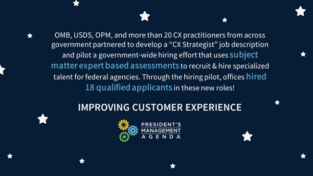 In partnership with the U.S. Digital Service and the Office of Personnel Management, the Customer Experience (CX) CAP Goal team piloted a government-wide hiring effort this year to help recruit and hire specialized CX talent. More than 800 applicants applied for 30 new “CX Strategist” positions across more than a dozen agencies. The team kicked off a pilot cohort of 18 highly-qualified CX professionals, many of whom are experts from outside of the Federal Government.